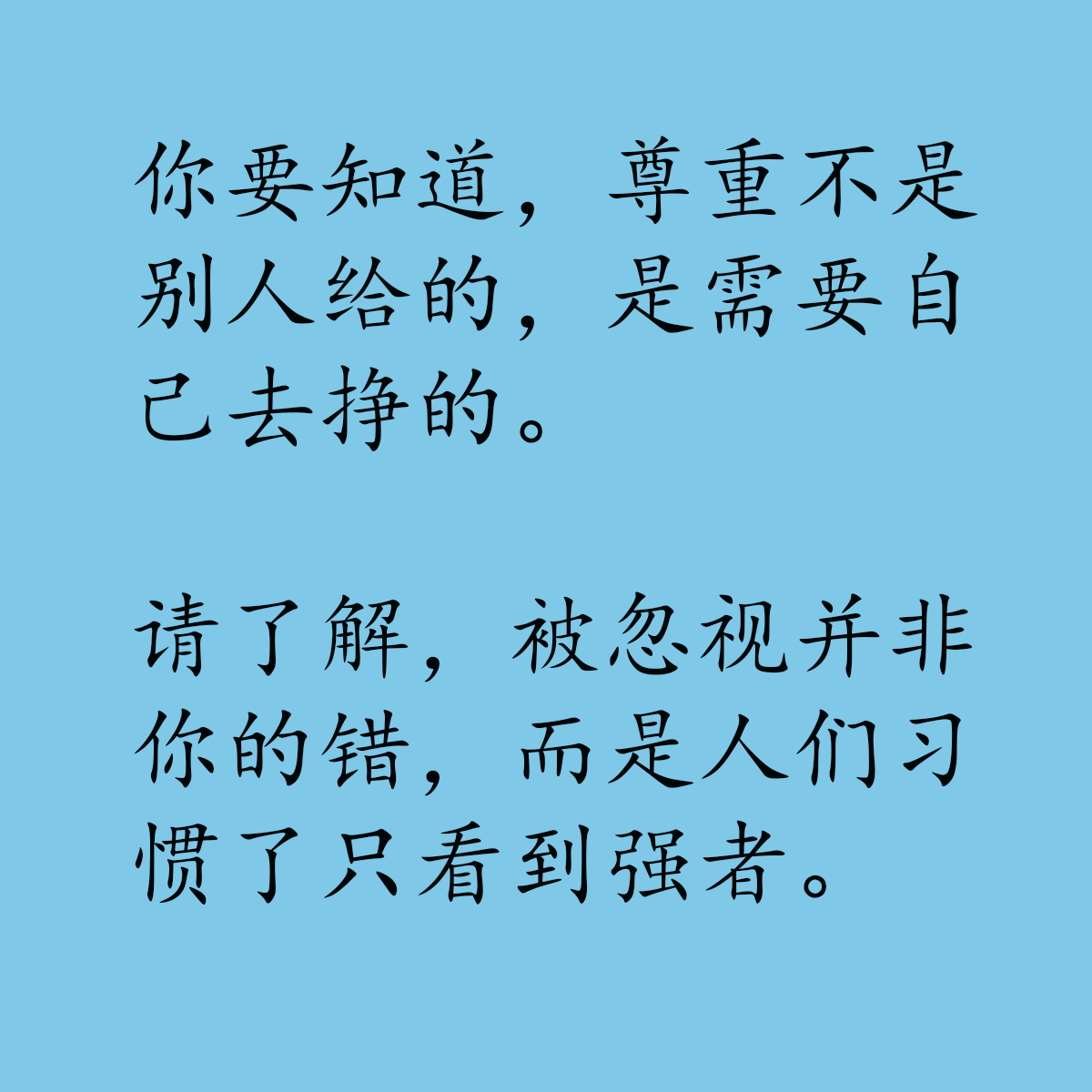 你要知道,尊重不是别人给的,是需要自己去挣的。请了解,被忽视并非你的错,而是人们习惯了只看到强者。
